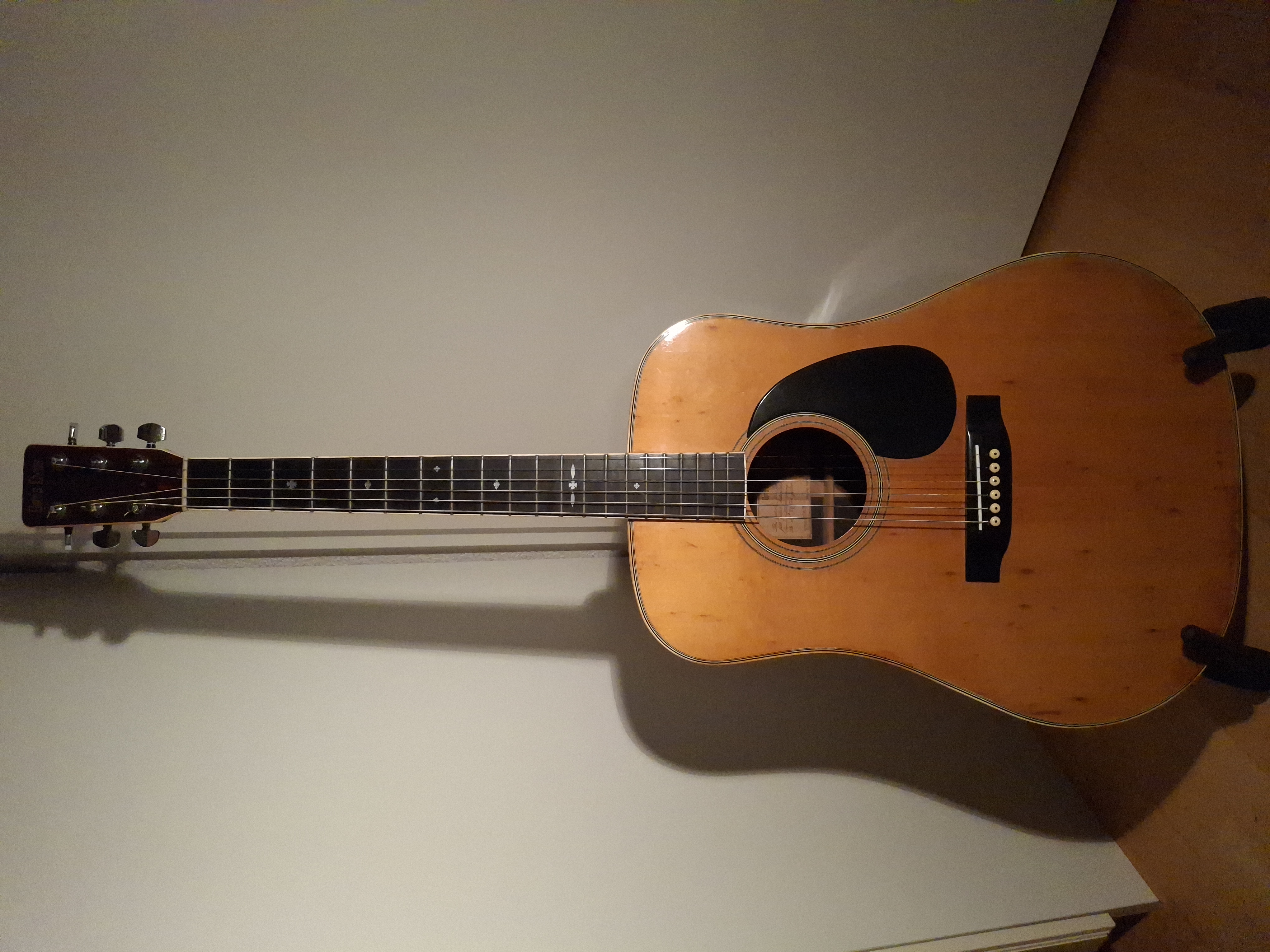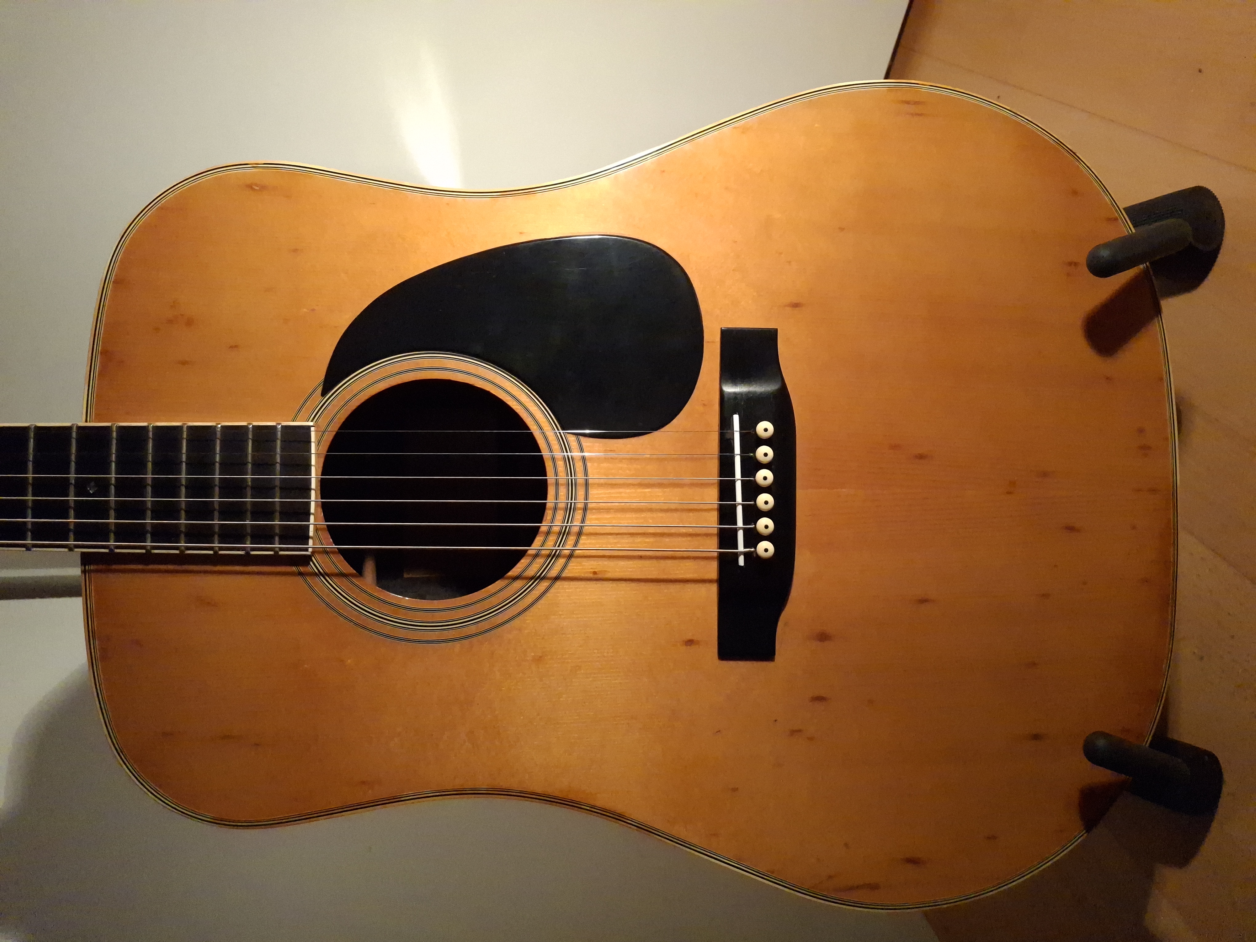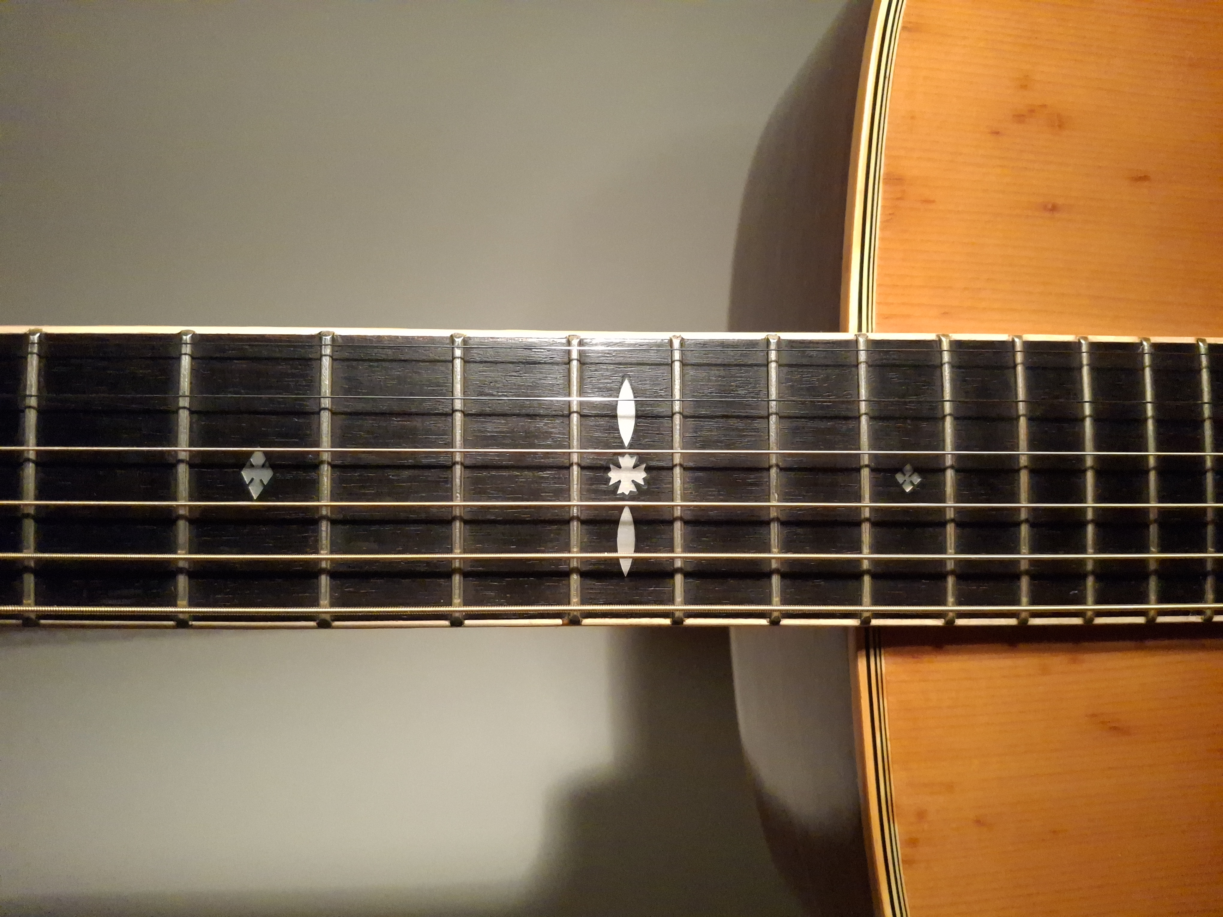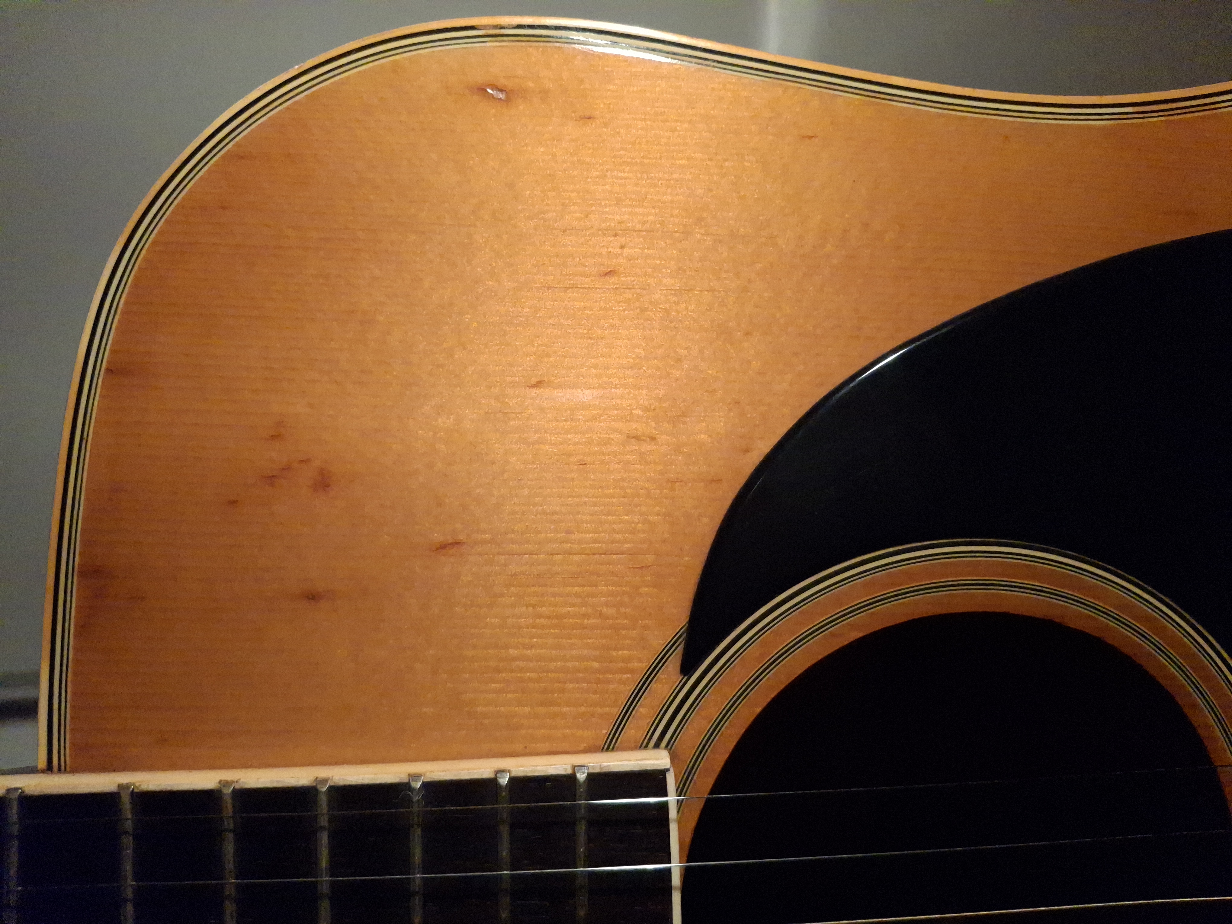 Aside from some stains on the top (likely caused by moisture seeping through small cracks in the finish), the guitar is in quite good condition for its age. The truss rod is adjustable, and the saddle has plenty of clearance.
