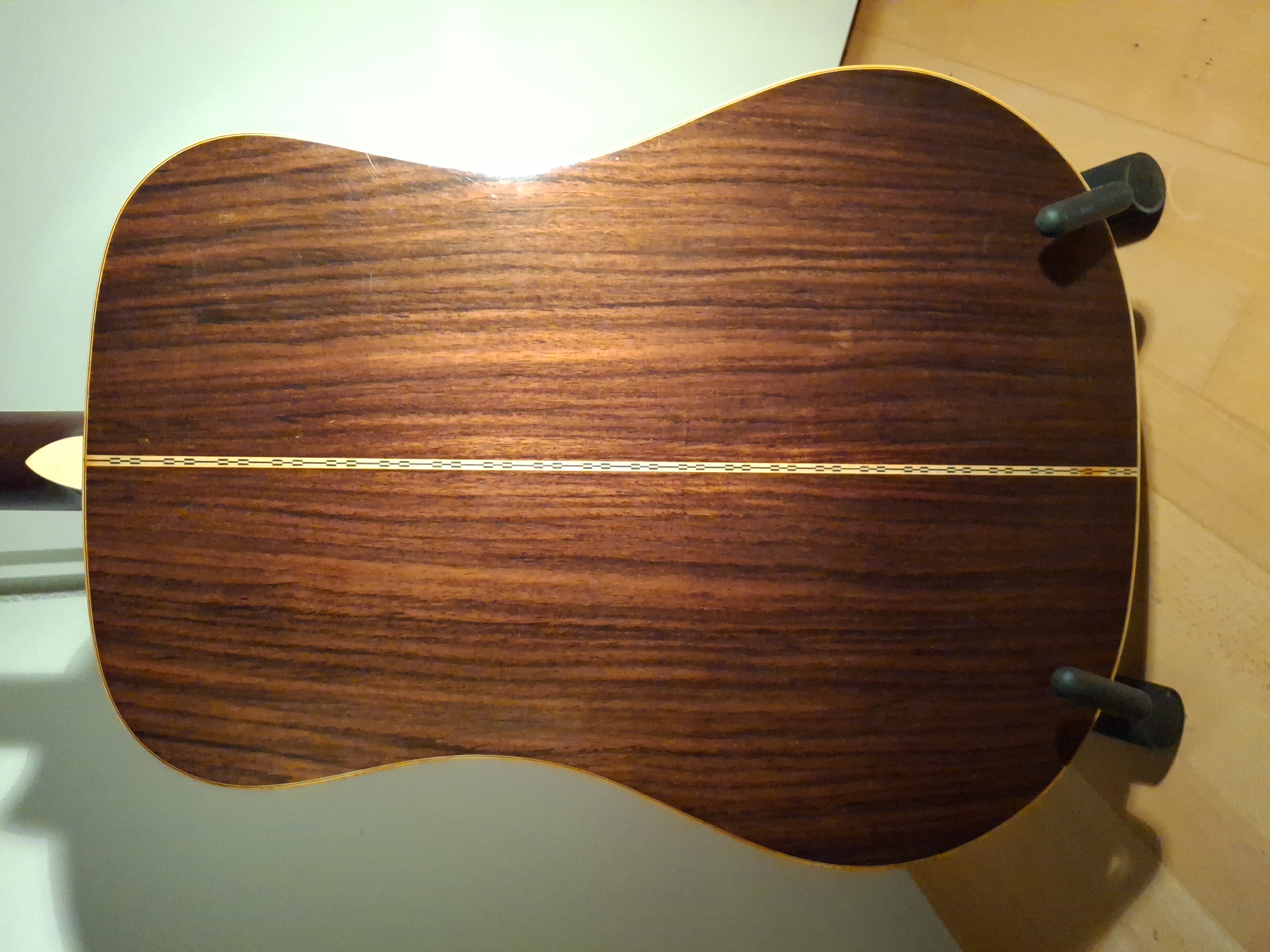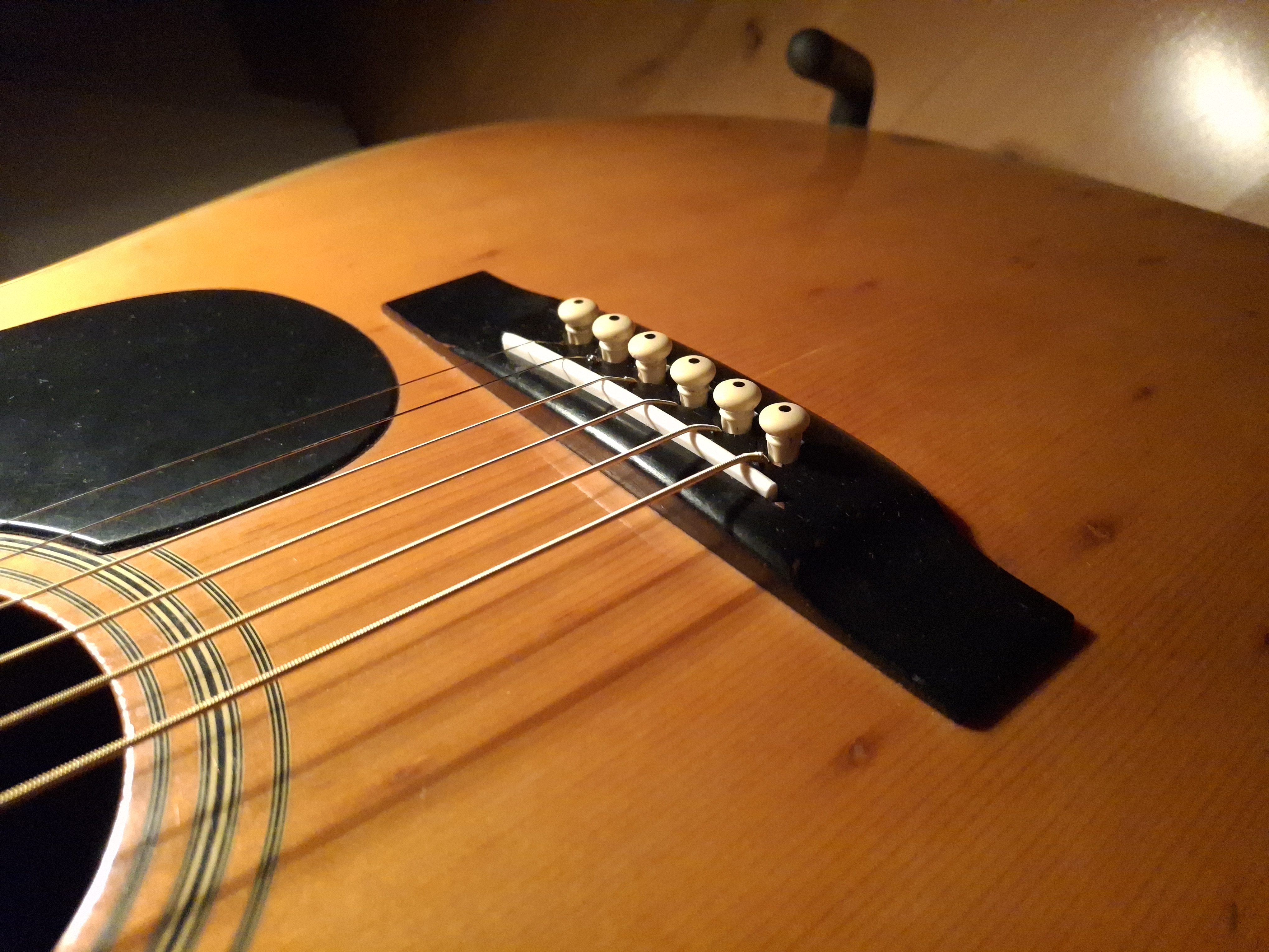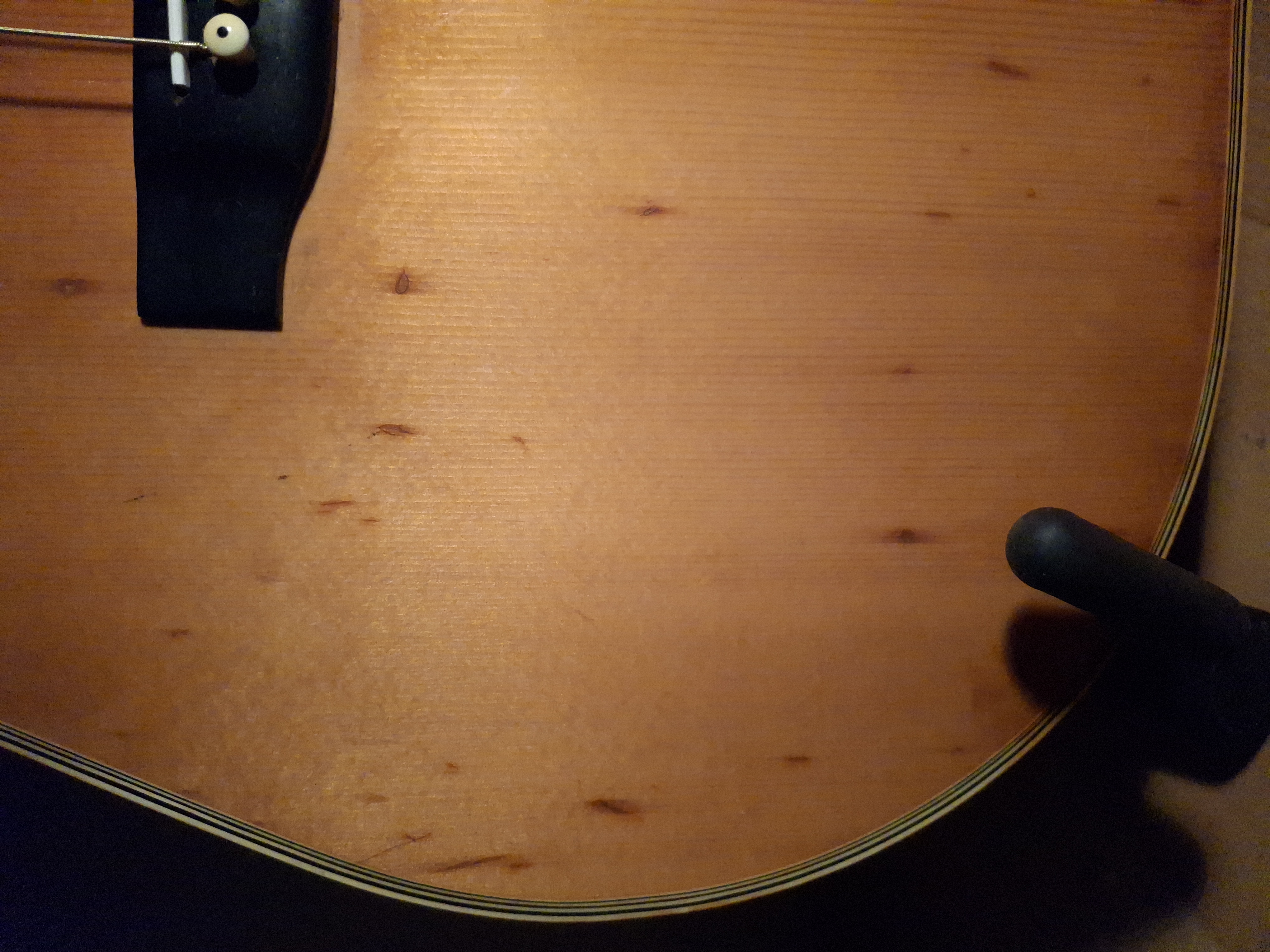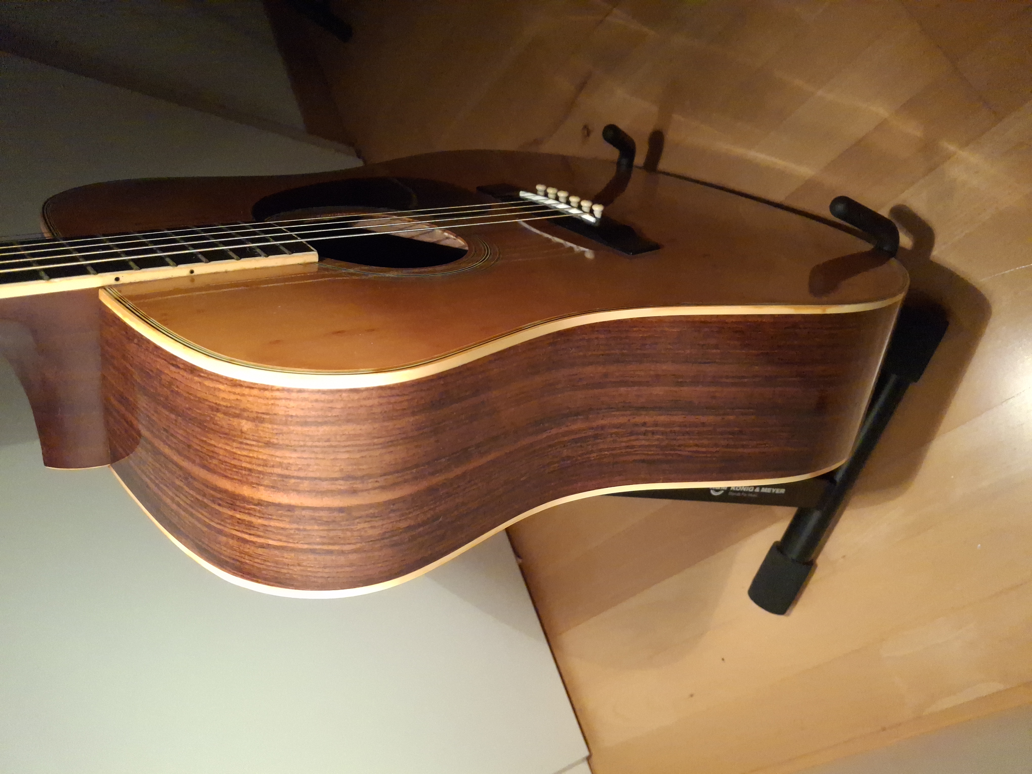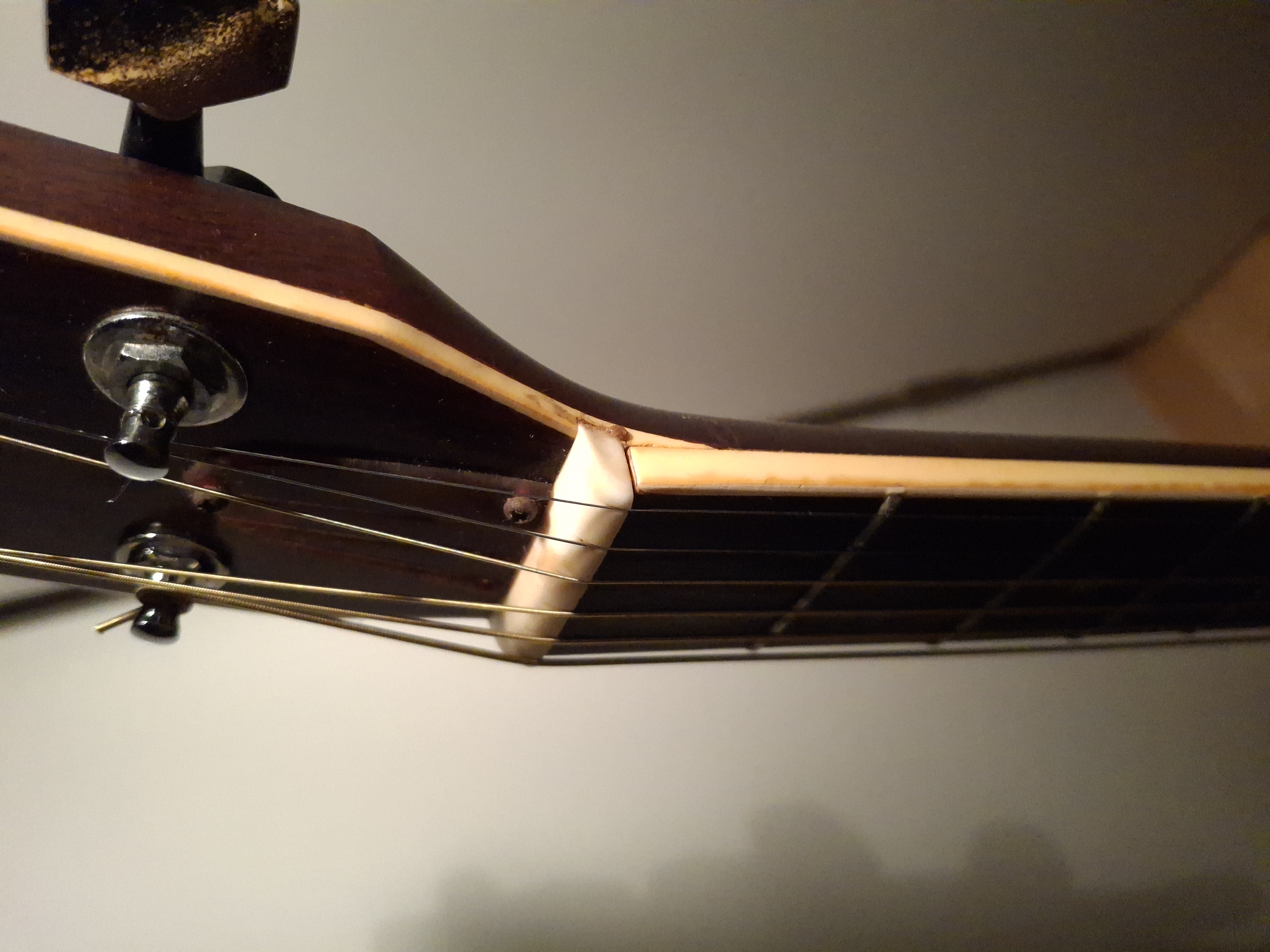 Aside from some stains on the top (likely caused by moisture seeping through small cracks in the finish), the guitar is in quite good condition for its age. The truss rod is adjustable, and the saddle has plenty of clearance.