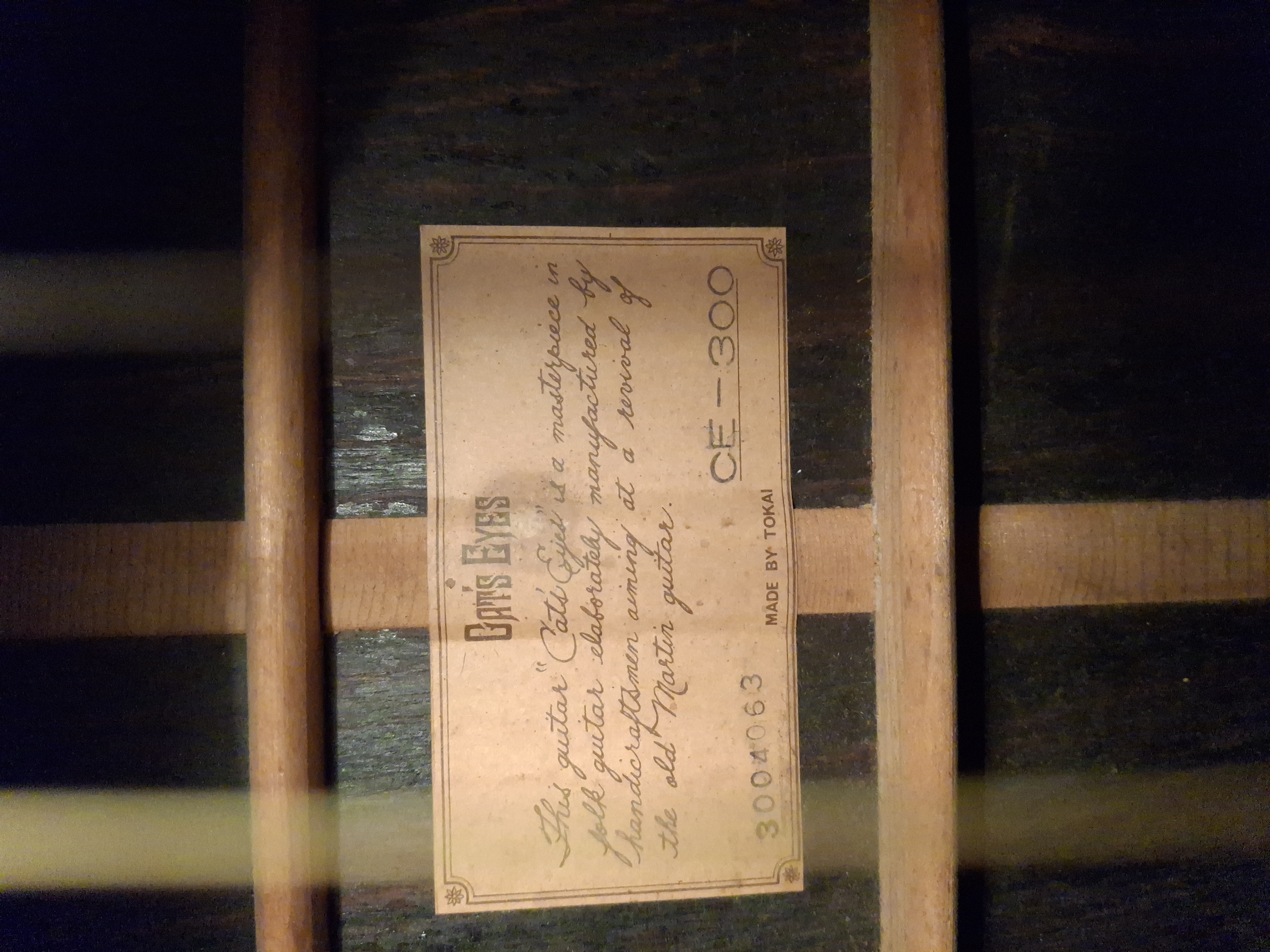 Tokai Cat's Eye CE-300 steel-string guitar, made in Japan in 1975. This particular example is from the first series, and features the logo in capital letters, the truss rod cover on the headstock, and the C. F. Martin Guitars reference on the label.